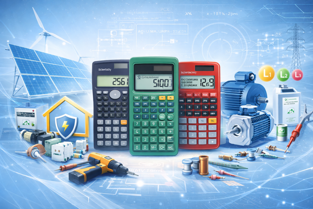 Calculadoras para corrección del factor de potencia, condensadores y parámetros eléctricos habituales en instalaciones industriales.
